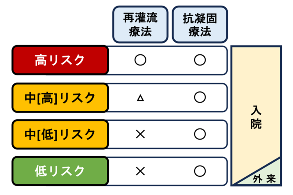 再灌流療法は出血の危険も高く、高リスク例や中[高]リスク例で循環動態が悪化してきた場合に検討します。抗凝固療法には、古典的にはヘパリン+ワルファリンが用いられてきましたが、DOAC も適応が通っています。