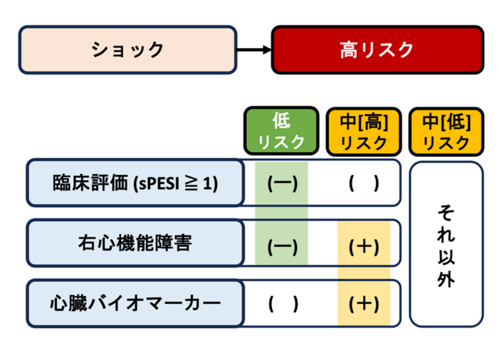 - 「右心機能障害があり」かつ「心臓バイオマーカー陽性」の場合、中[高]リスク